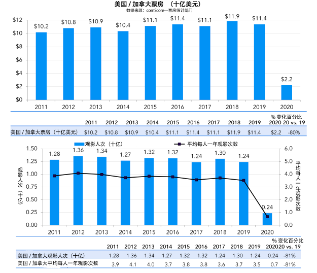 2020年由于新冠病毒大流行,美国/加拿大票房年度票房为22亿美元,较2019年的114亿美元下滑了4%。在观影人次和电影票售出方面,2020年美国/加拿大的总观影人次为2.4亿人次;较2019年下降了81%。