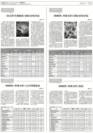 - 《蜘蛛侠:英雄无归》国际市场夺冠上周末的国际市场的冠军是索尼公司发行的《蜘蛛侠:英雄无归》,新增6440万美元的国际周末票房,其国际...