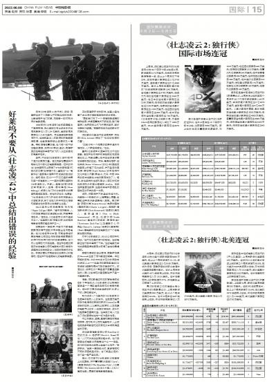 - 《壮志凌云2:独行侠》国际市场连冠上周末,派拉蒙公司发行的《壮志凌云2》在64个国际市场上映第二周,新增票房8170万美元,排在国际周...