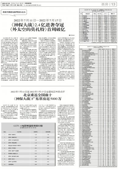 2022年第28周(7月11日至7月17日),新老影片稳定市场,大盘七天收入6.59亿,比上一周小幅...