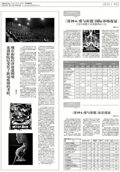 - 《雷神4:爱与雷霆》国际市场连冠上周末,迪士尼/漫威的《雷神4:爱与雷霆》在国际市场中新增票房6010万美元,跌幅为59%,其国际累...