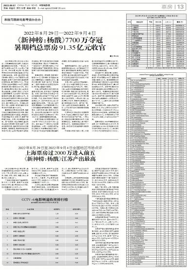 - 《新神榜:杨戬》7700万夺冠 暑期档总票房91.35亿元收官2022年第35周(8月29日-9月4日),本周暑期档正式结束,大盘也恢复到暑期之前的规模。一周七天...