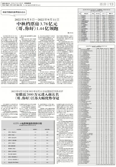 9月5日至9月11日(第36周),全国电影票房排名上半区的十五省市依次为:广东、江苏、浙江、北京、安...