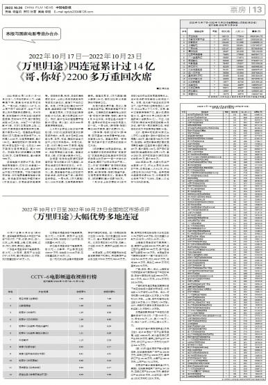 - 《万里归途》四连冠累计过14亿 《哥,你好》2200多万重回次席2022年第42周(10月17日-10月23日),几乎没有新片入市,大盘再度下降,甚至低于国庆节前低...