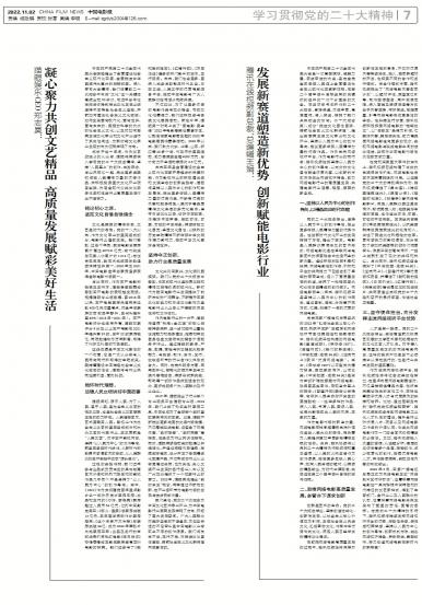 - 发展新赛道塑造新优势 创新赋能电影行业中国共产党第二十次全国代表大会是一次高举旗帜、凝聚力量、团结奋进的大会,是在全党全国各族人民迈上全面...