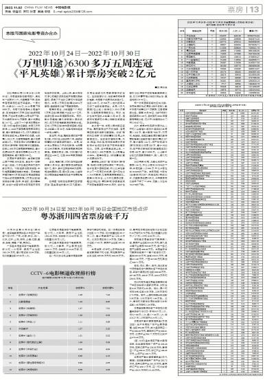 - 《万里归途》6300多万五周连冠 《平凡英雄》累计票房突破2亿元2022年第43周(10月24日-10月30日),本周全国各地疫情反扑,且没有一部新片入市,大盘再度...