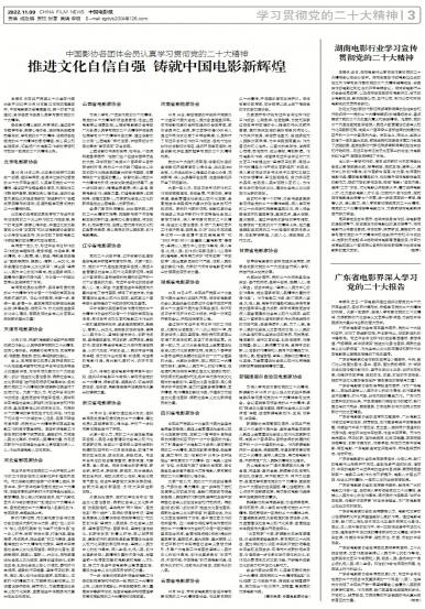 - 推进文化自信自强 铸就中国电影新辉煌本报讯 中国共产党第二十次全国代表大会于2022年10月16日至22日在京隆重召开,中国电影家协会高...