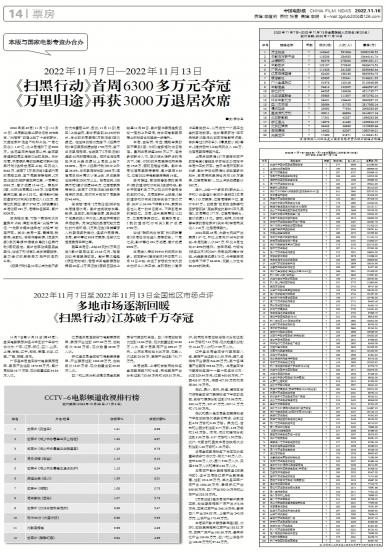 - 《扫黑行动》首周6300多万元夺冠 《万里归途》再获3000万退居次席2022年第45周(11月7日-11月13日),本周影院影业率依旧在60%左右,“光棍节”前后上映了...