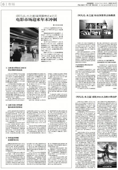 本报讯 经过13年等待,《阿凡达:水之道》于12月16日在全国IMAX影院公映,并提前两天开启全国点...