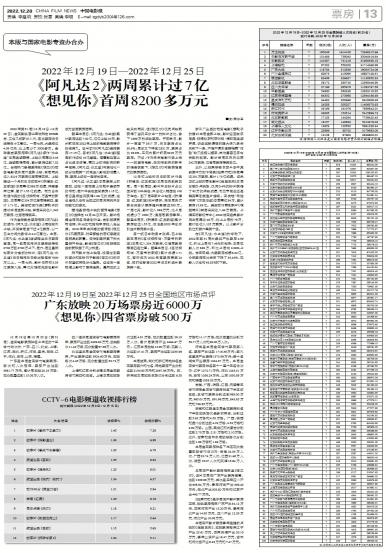 - 《阿凡达2》两周累计过7亿 《想见你》首周8200多万元2022年第51周(12月19日-12月25日),全国影院营业率依然在80%左右,又有几部新片入市,...