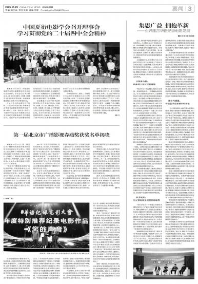 - 中国夏衍电影学会召开理事会 学习贯彻党的二十届四中全会精神本报讯 10月26日,中国夏衍电影学会第五届理事会四次会议在北京召开。学会会长江平主持会议,副会长孙...