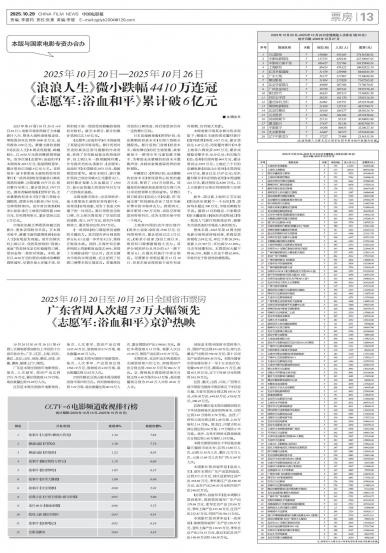 - 《浪浪人生》微小跌幅4410万连冠 《志愿军:浴血和平》累计破6亿元2025年第43周(10月20日-10月26日),电影市场依然缺乏大体量新片入市,整体大盘热度继续走...